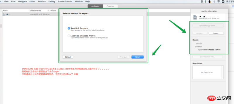 麻烦大神榜我看下。如图 我在archive之后 就变成图片中的样子了,现在不知道是哪个环节错了 导致无法生成ipa。补充:我的工作控件里面包含了多个target 当前用的是xcode8.2