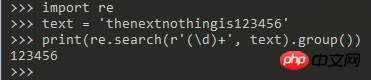 >>> import re >>> text = 'thenextnothingis123456' >>> print(re.search(r'(\d+)', text).group(0)) 123456 >>> 可以用(\d+)规则匹配~ 同问为什么r'(\d*)无法匹配出字符串"123456"?