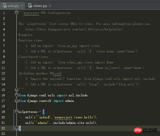 urlpatterns = [ '', url(r'^index$','newproject.views.hello'), ... ]