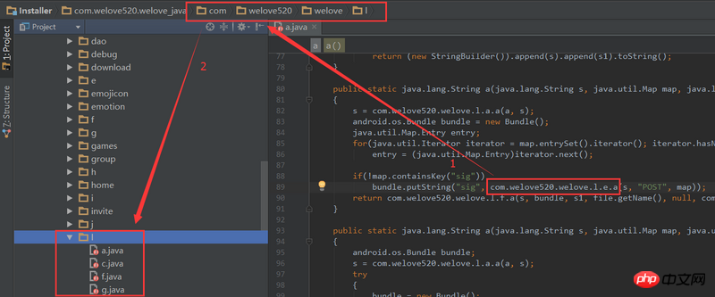反编译之后,根据代码我要找到com.welove520.welove.l.e.a(String, String, Map)这个函数,但是打开对应的包路径发现并没有e这个类,smali对应的包下也没有该类。