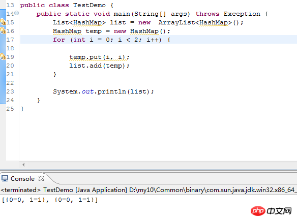 List<HashMap> list = new ArrayList<HashMap>(); HashMap temp = null; for (int i = 0; i < 2; i++) { temp = new HashMap(); // 每次都创建一个新的HashMap对象 temp.put(i, i); list.add(temp); } System.out.println(list);