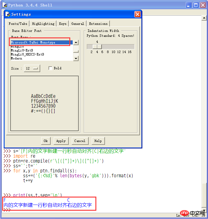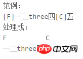 >>> s='[F]内的文字新建一行秒自动对齐[C]右边的文字' >>> import re >>> ptn=re.compile(r'\[([^]]+)\]([^[]+)') >>> ss='';t='' >>> for x,y in ptn.findall(s): ss+=('{:<%d}'% len(bytes(y,'gbk'))).format(x) t+=y >>> print(ss,t,sep='\n') F C 内的文字新建一行秒自动对齐右边的文字