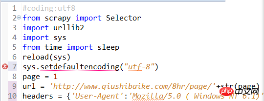 import sys reload(sys) sys.setdefaultencoding("utf-8") 我用的python2.7 eclipse-pydev,这上面第三行设置编码老是提示错误!不知道怎么回事。如下图第7行,前面这个红X,下面一条红线,意思就是说这行代码有错。