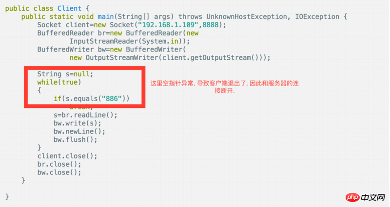 s是 null, 因此进入 while 中时, 导致NullPointerException, 因此客户端直接退出了, 进而和服务器的连接没有正常关闭, 所以服务器报Exception in thread "main" java.net.SocketException: Connection reset异常.第二个客户端代码中,
