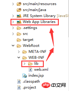 在Eclipse上创建Web项目,默认会产生一个WebRootWEB-INFlib目录,jar包复制到该目录后会自动加载到Web App Libraries库中,效果如下: