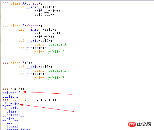 dir(b)裡面有:__init__(從A繼承的)_A__priv(從A繼承的)_B__priv(自己定義的)public(自己定義的)最後當
