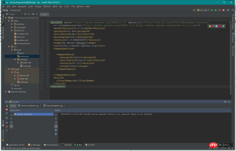 用idea创建了一个maven web项目,tomcat能启动,但是部署不了项目,提示:Artifact dp:war exploded: Server is not connected. Deploy is not available.