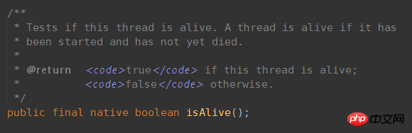 isAlive方法的实现,发现isAlive是一个 native 方法 —— 不过没关系,我们可以看它的 javadoc 注释:"A thread is alive if it has been started and has not yet died"