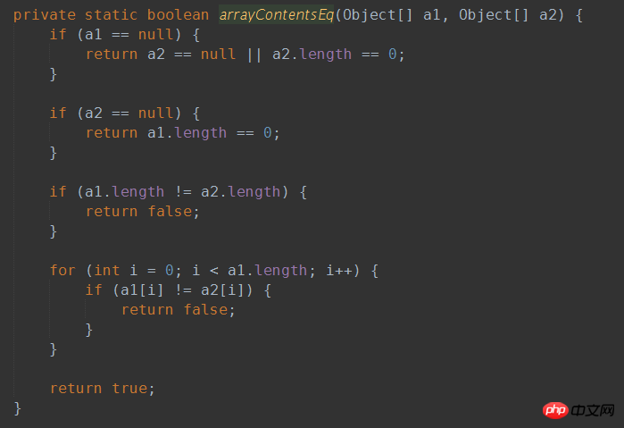 private static boolean arrayContentsEq(Object[] a1, Object[] a2) { if (a1 == null) { return a2 == null || a2.length == 0; } if (a2 == null) { return a1.length == 0; } if (a1.length != a2.length) { return false; } for (int i = 0; i < a1.length; i++) { if (a1[i] != a2[i]) { return false; } } return true; }