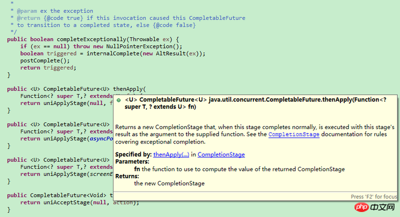 查看Java8中CompletableFuture.java的源码,发现thenApply方法上面没有写注释,但是将鼠标放到thenApply上面却可以看到注释,请问这是为什么呢?