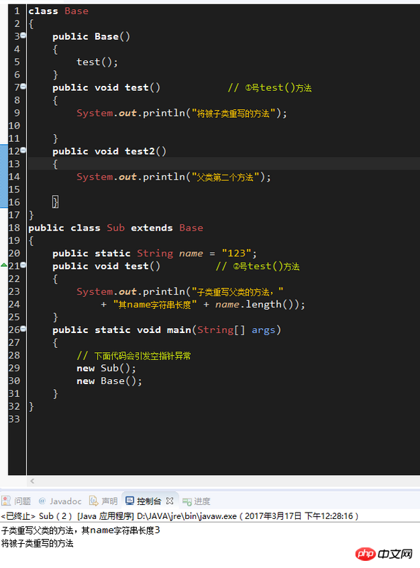你在父类的构造方法里调用了test()方法,这样在new的时候就会去调用test(),然而你并没有调用test2()方法,肯定不会有输出啊,这是java基本原则。你可以这样写,就会有输出了。public Base{test();test2();}